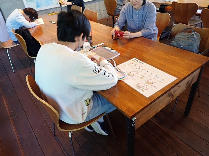 缶バッチをオリジナルのイラストで作った生徒さんや、丁寧に塗り絵で作った生徒さんもいらっしゃいました。最後は自分の力で缶バッチマシーンをガチャン!きれいに作れました♪